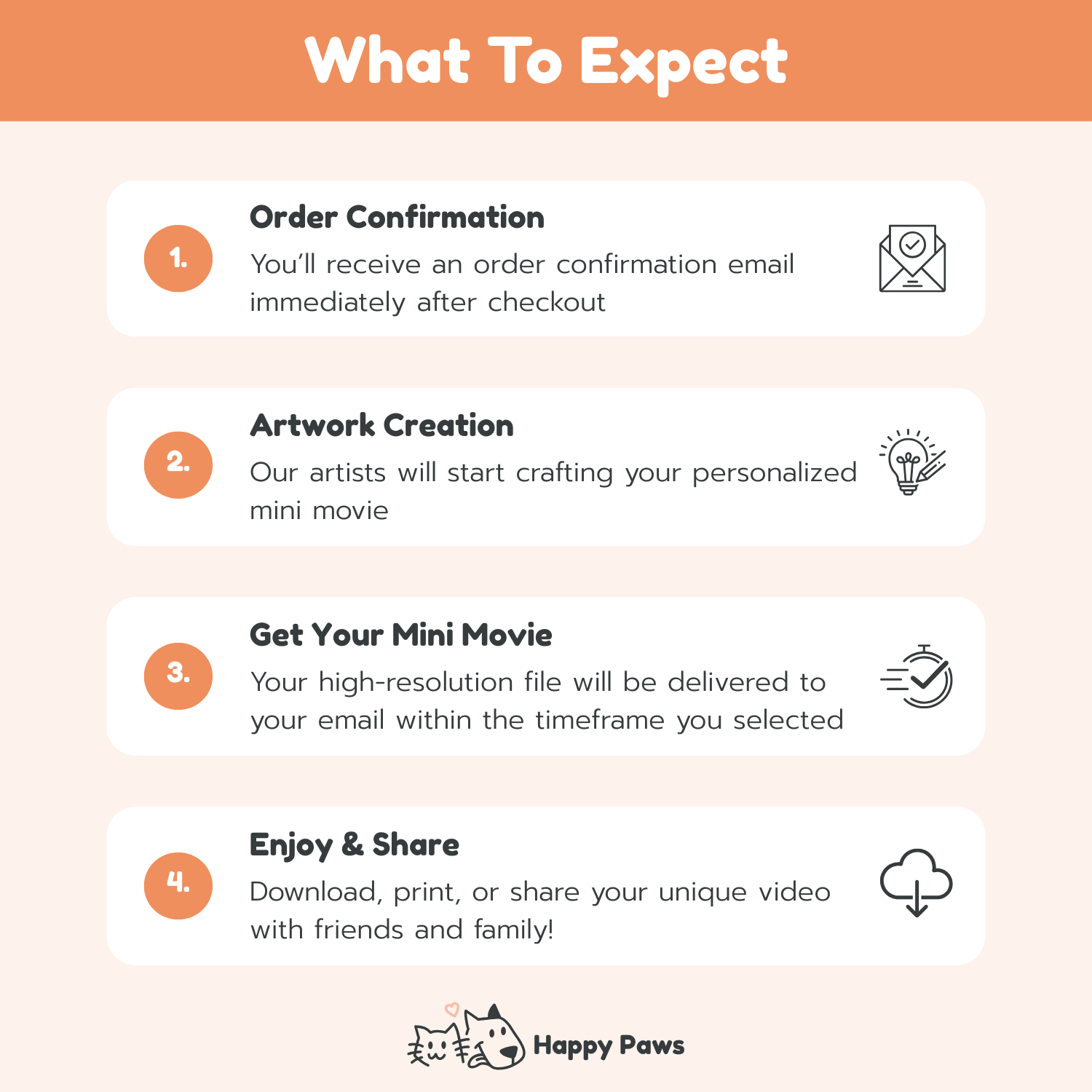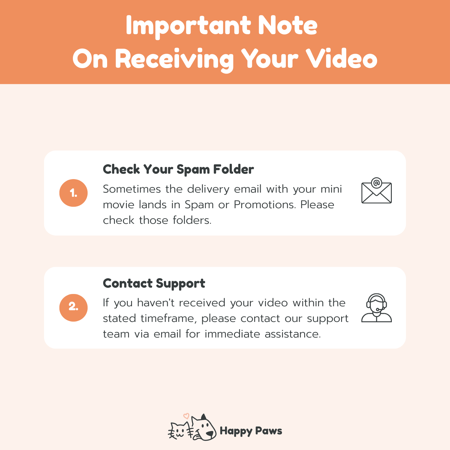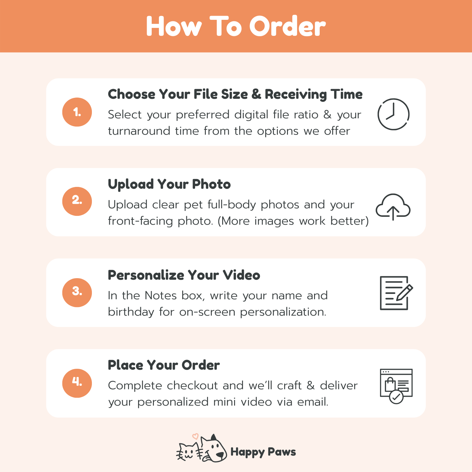 - Happy Paws provides digital products in the form of vertical personalized videos based on scenarios listed on our website. No physical shipping is involved.